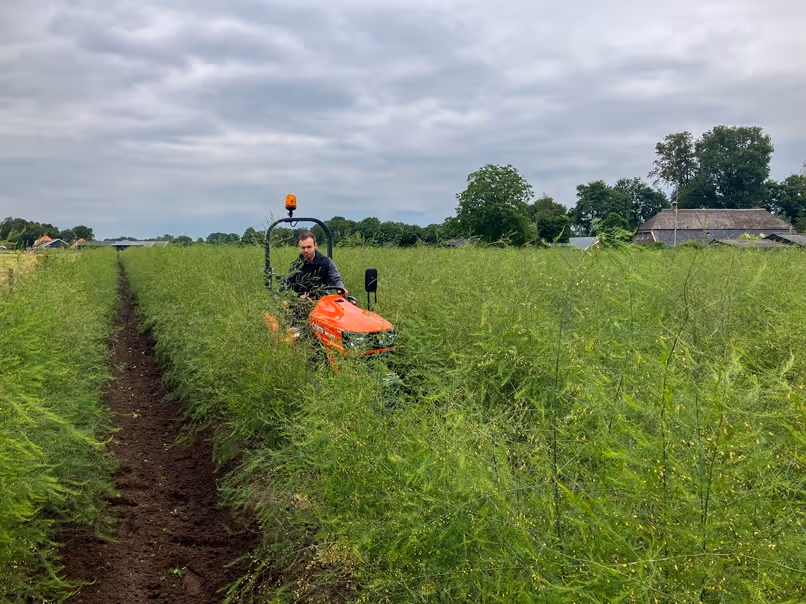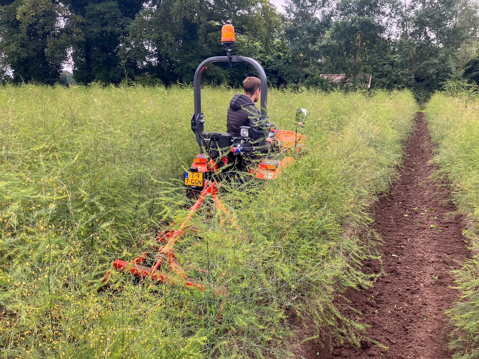 Gewasbescherming met name biostimulanten zodat je minder chemie nodig hebt, mechanische onkruidbestrijding met cultivator, vingerwieder met combinatie van schoffels en zaaien van groenbemester in de asperges.