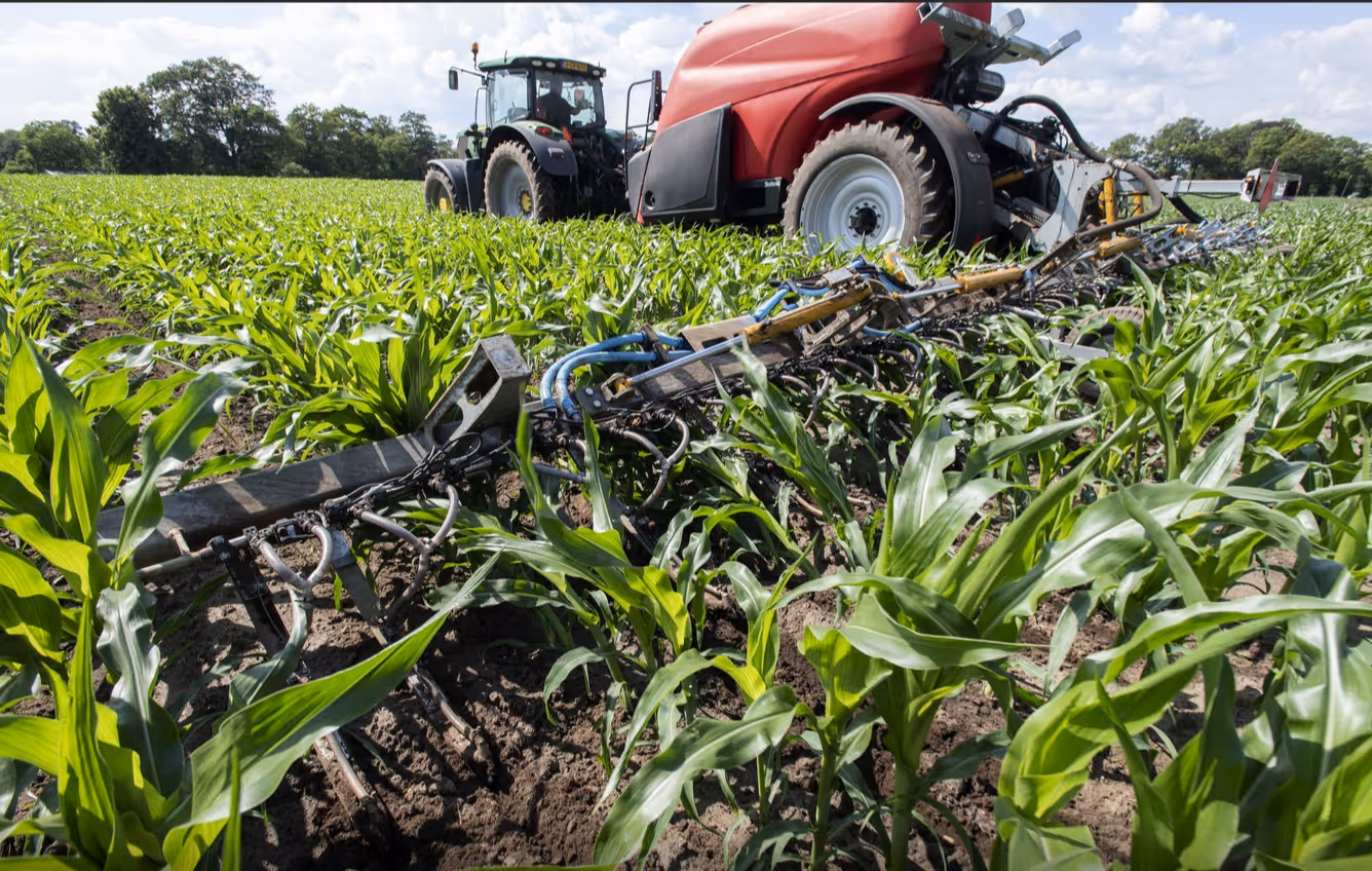 Langzaam rijdt de tractor op dunne banden en gps-gestuurd precies tussen de 60 centimeter hoge maisplanten door. Daarachter hangt iets revolutionairs: een nieuwe innovatieve bemester met een uitgeklapte werkbalk van zo’n 15 meter breed. De door Slootsmid Mesttechniek in Borculo ontwikkelde machine spuit vloeibare mest precies tussen de rijen maisplanten door in de grond. Vertegenwoordigers van Duitse en Nederlandse landbouwbedrijven en organisaties kijken belangstellend toe.