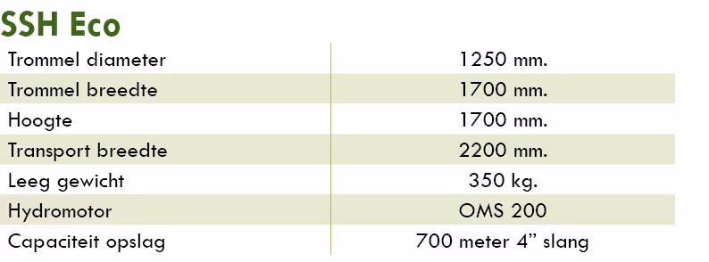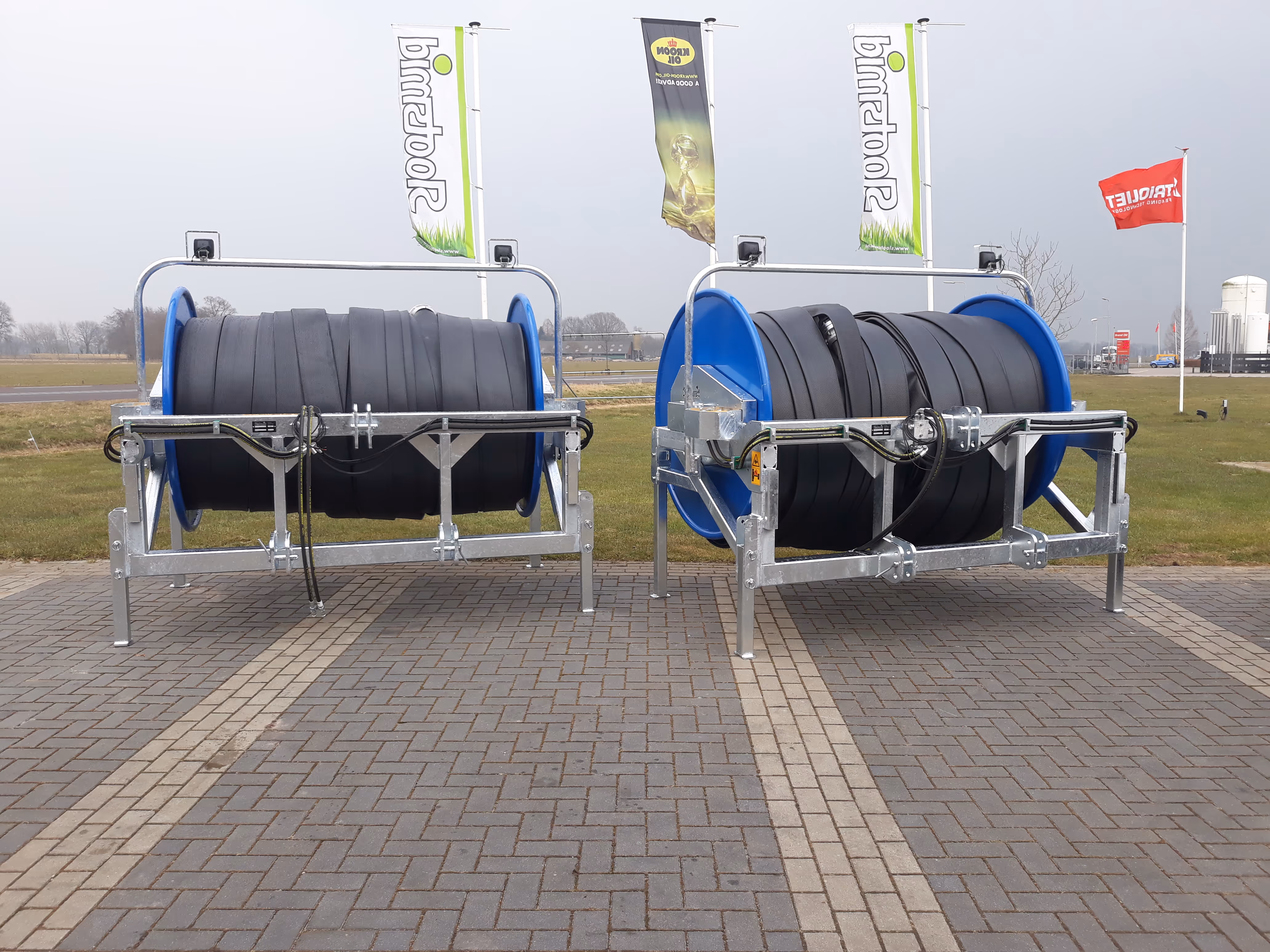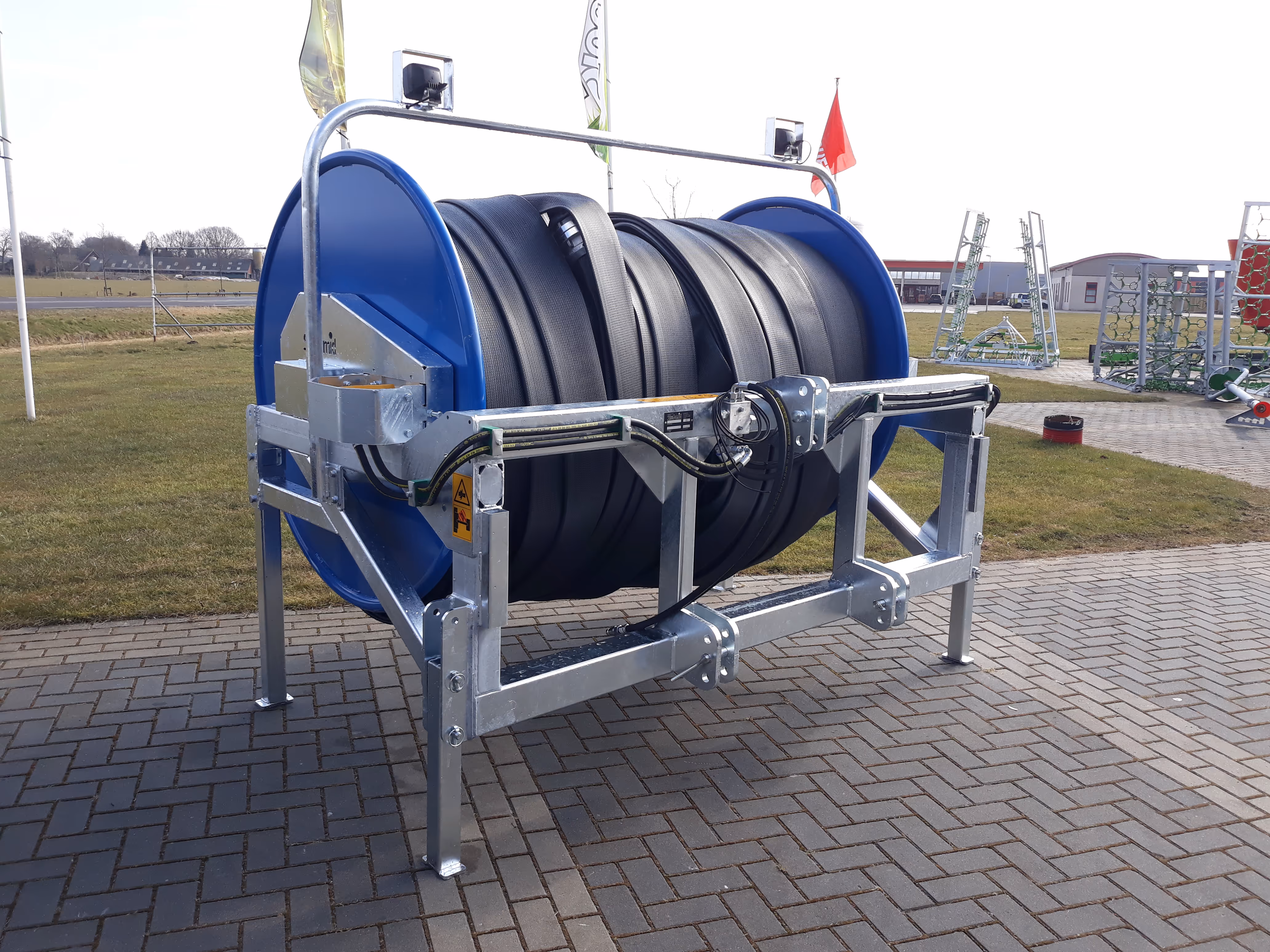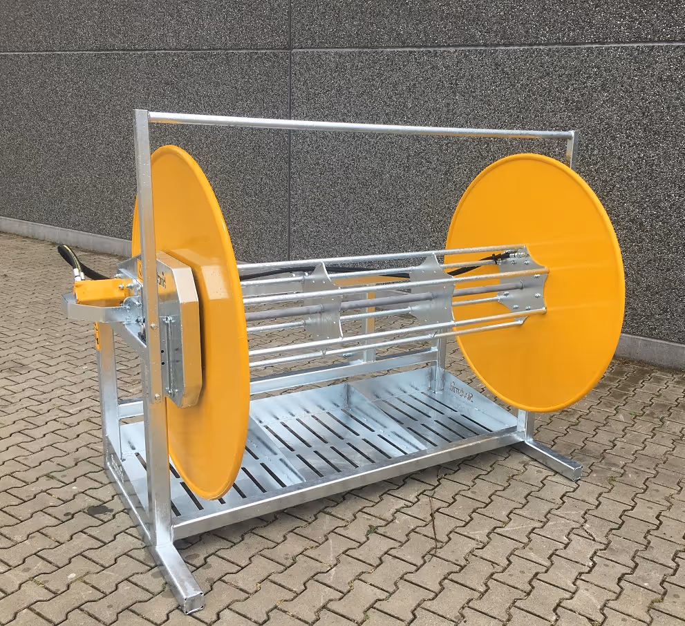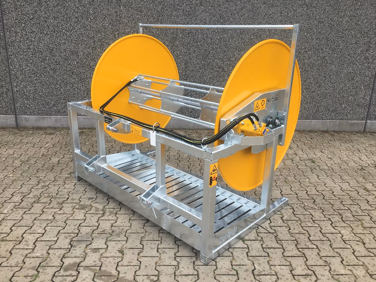 De haspel biedt een ruime opslagruimte voor koppelingen, gereedschap etc. Het frame is compleet volbad verzinkt en de haspelwanden zijn tweelaags gecoat. Middels een zware ketting aandrijving wordt de haspel hydraulisch aangedreven.
