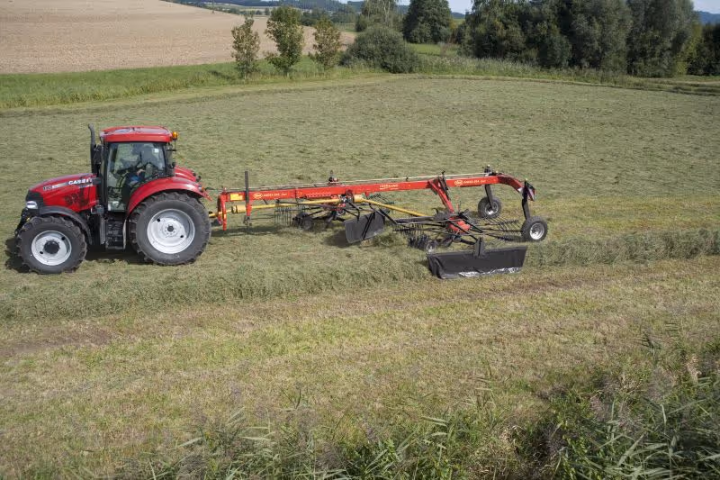 De zij-afleghark Andex 774 met gecontroleerde besturing is uitgerust met 1x12 en 1x13 dubbele tangentiale tandarmen. Instelbare curvebanen maken op elk moment de best mogelijke zwadvorming mogelijk. Exceptionele wendbaarheid en een royale bodemvrijheid met geheven rotoren dragen bij aan de superieure prestaties van deze hark. De Andex 774 biedt een unieke flexibiliteit – hij kan één grote wiers produceren of twee kleinere wiersen (optioneel). Hij is heel makkelijk om te stellen tussen de verschillende configuraties. Dankzij het zijaflegsysteem kan de hark het gewas van 14,5 m in één enorme wiers harken.