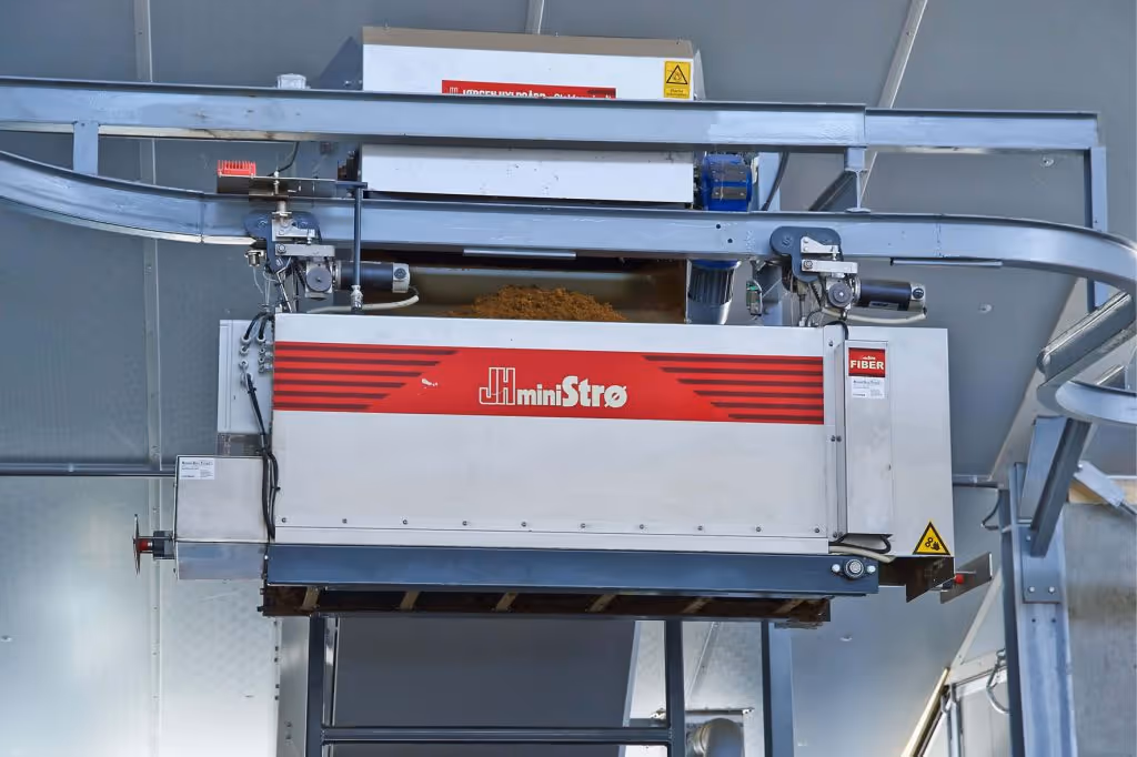 Het JH Ministro systeem van JH Agro uit Denemarken distribueert automatisch verschillende beddingmaterialen zoals stro, hooi, zaagsel en gescheiden mest. Bovendien is het systeem ideaal voor het verdelen van ruwvoer bij varkens, geiten en/of kippen. Het systeem kan in zowel bestaande als nieuwe stallen worden geïnstalleerd. JH MiniStro-robots zijn compact maar zeer efficient en verdelen meerdere keren per dag materiaal gelijkmatig, in tegenstelling tot andere systemen.